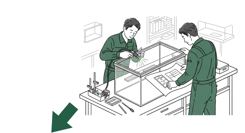 設計図通り、かつ耐久性の高い水槽を確実に製作し、エンドユーザー様にご満足いただける品質をお約束します。製造期間中も、貴社へ進捗状況の共有が可能です。