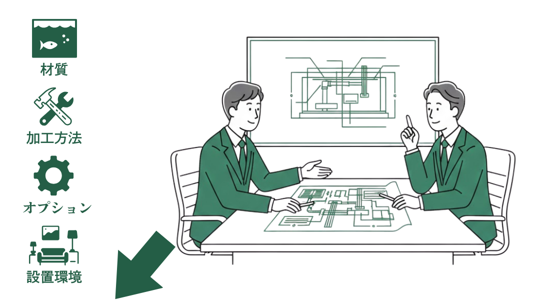 エンドユーザー様のご要望に基づき、水槽の設置環境、ご希望のサイズや材質、特殊な加工・穴あけの有無、周辺機器との連携などについて、詳細なヒアリングを実施します。貴社との連携を密にし、技術的な観点から最適な設計と仕様をご提案することで、トラブルのない確実な受注をサポートいたします。